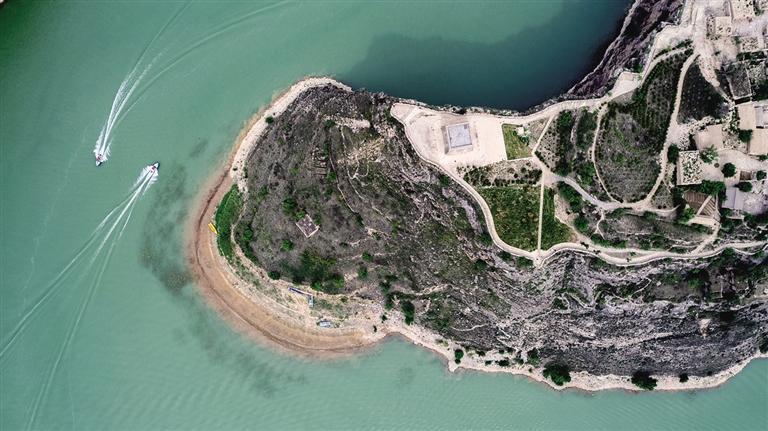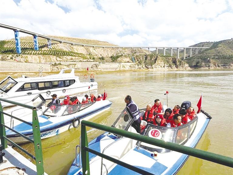 游客在老牛湾黄河大峡谷旅游区乘坐快艇